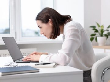また、机の高さが合わない場合、パソコン作業では肩をすくめたり前かがみになったりするクセが生じ、腰だけでなく首や肩にもストレスを及ぼします。